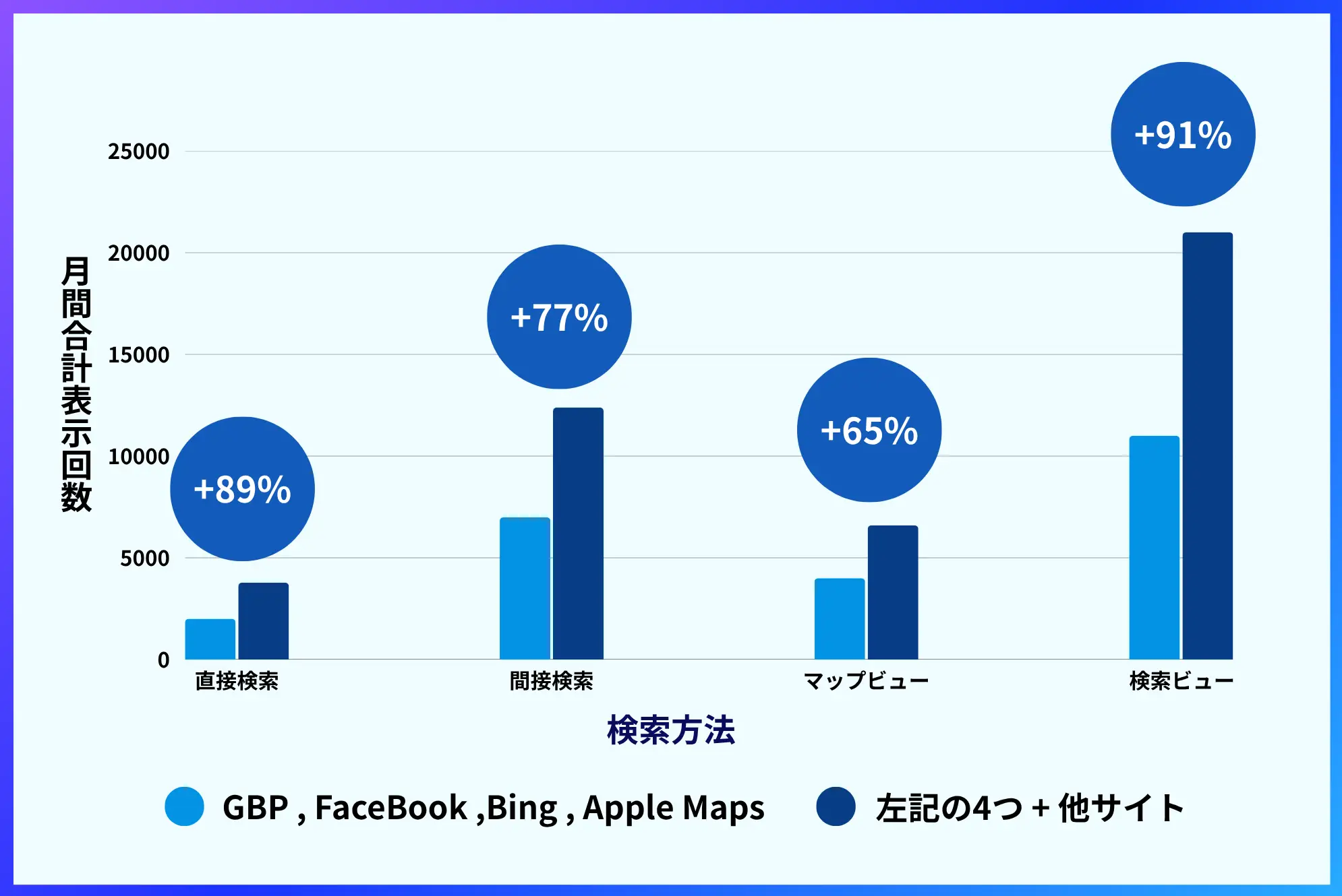 実際に、米国のSEO企業「Moz」が行った調査では、10以上の他サイトに店舗情報を登録したグループは、登録前に比べてGoogle検索での表示回数が91%も増加したというデータがあります 。これは、サイテーションの整備が、ユーザーの目に触れる機会(インプレッション)を劇的に増やす直接的な証拠です。